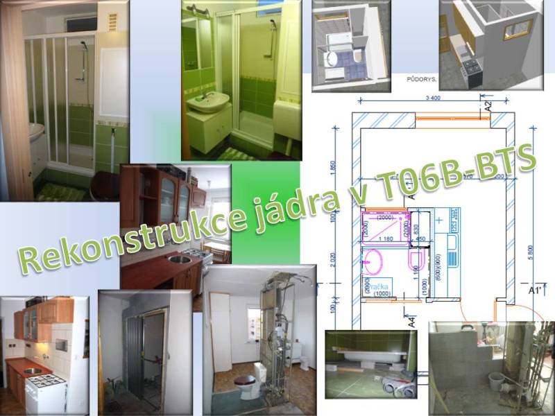 Nahrazení dosloužilého umakartového bytového jádra za nové zděné, výměna rozvodů - elektro, plyn, voda, odpady. Nové omítky a podlahy. Technický návrh koupelny a kuchyně, vizualizace. Organizace výběrového řízení na zhotovitele. Technický a autorský dozor.